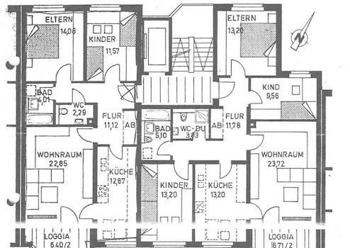 Wohnzimmer 22.85 qm, Küche 12.87 qm, Schlafzimmer 14.08 qm, Kinderzimmer 11.57 qm, Diele/Flur 11.12 qm, Loggia 6.40/2 qm