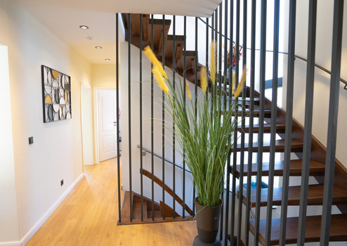 Sanitäranlagen und der Elektroinstallation – inklusive moderner Smart-Home-Technologie. Die Fußbodenheizung im Erdgeschoss und Obergeschoss sorgt für