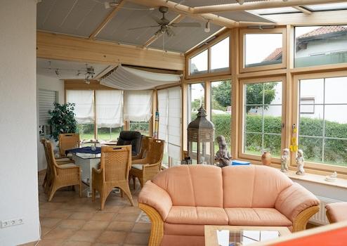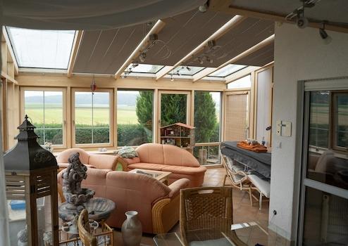 - Großer Wohnwintergarten – aufgeteilt in Wohnzimmer und separates Zimmer, beide mit Fußbodenheizung