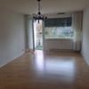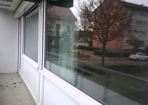 Der Flur führt an einem Abstellraum mit Einbauregalen bis zum Wohnzimmer, dem ebenfalls ein Balkon , hier nach Westen zeigend, vorgelagert ist. Man blickt ins Gründe, da sich auf der anderen Straßenseite einige Schrebergärten befinden.
