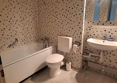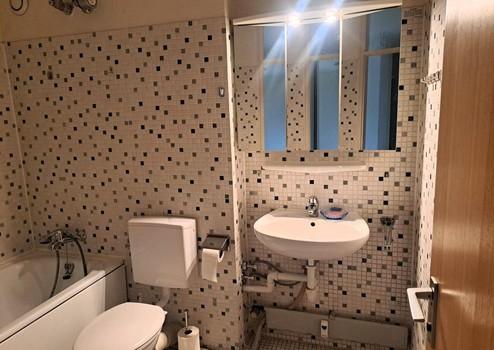 Die Wohnküche hat ebenso wie das Schlafzimmer eine Fläche von 14 m², ist mit einem pflegeleichten PVC/Linoleum-Boden ausgelegt. Die Küche ist einige Jahre im Gebrauch, Herd, Kühlschrank und Spühlmaschine funtionieren problemlos. Das Wohnzimmer ist gut 20m² groß, vorgelagerter Balkon mit Blick ins Grüne für angenehme Sommerabende. Im innen liegenden Badezimmer findet sich eine Badewanne, WC und ein Waschmanschinenanschluß. Hier könnte man bei Selbstnutzung eine Umgestaltung überlegen.