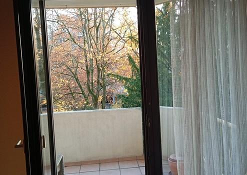 Der Balkon öffnet sich zum begrünten, ruhigen kleinem Spielplatz — ein echtes Privileg in dieser urbanen Lage. Der Balkon ist sowohl vom Wohnbereich als auch vom Schlafzimmer zugänglich.