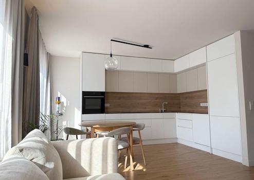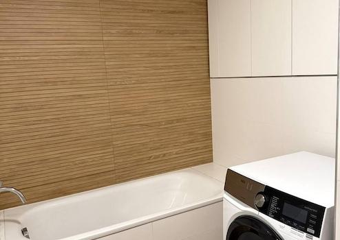 In der gesamten Wohnung wurde Vinyl-Laminatboden verlegt. In allen Räumen wurden neue Heizkörper installiert.