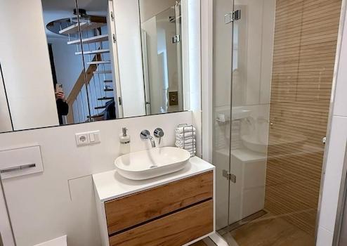 - Im Erdgeschoss befindet sich ein Gäste-Badezimmer mit Dusche und Fußbodenheizung.