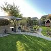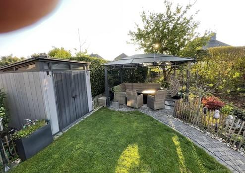Der gepflegte, nahezu nicht einsehbare Garten verfügt über ein Gartenhaus, ein überdachte Terrasse und einen romantischen Pavillon sowie einen kleinen Bachlauf mit Teich.