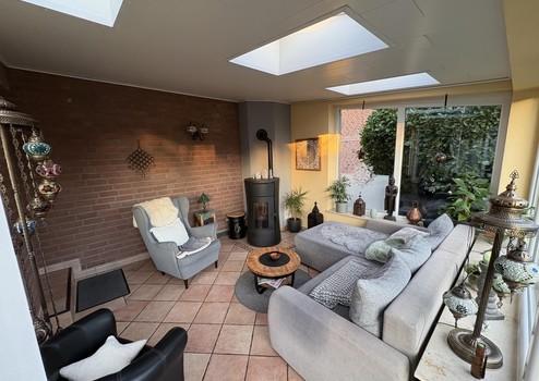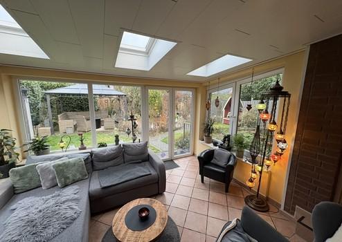 Ein besonderes Highlight für gemütliche Stunden ist der nachträglich angebaute Wintergarten mit einem modernen, wasserführenden Pelletofen und einem tollen Blick in den Garten.