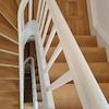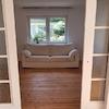 Über eine Holztreppe gelangt man in den ersten Stock, wo die Räume ebenfalls hell und lichtdurchflutet sind. Im Wohnzimmer sind alte Holzdielen freigelegt, und auch hier öffnet sich der Blick auf den Garten. Diese Wohneinheit umfasst zudem drei Schlaf- bzw. Kinderzimmer, eine Küche und ein Badezimmer.