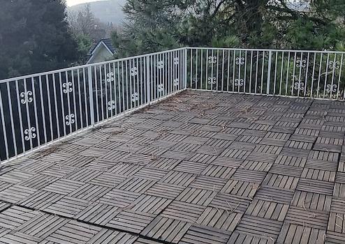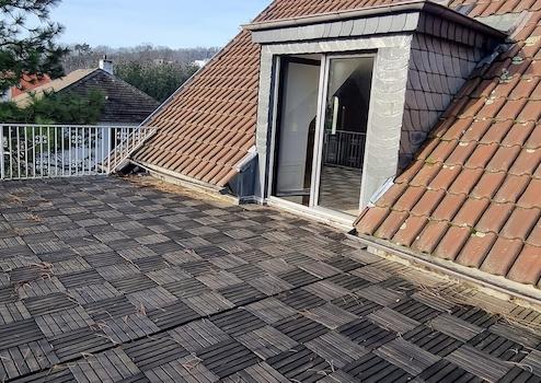 Das abgeschlossene Dachgeschoss besteht aus zwei Zimmern, einer kleinen Küche und einem Bad. Vom Wohnzimmer führt eine Tür auf die großzügige Dachterrasse mit herrlichem Blick ins Grüne.