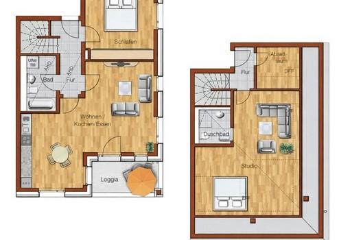 Über eine Innentreppe oder alternativ über den separaten Eingang vom Treppenhaus gelangen Sie in die obere Etage. Dort befinden sich ein einladendes Gäste-/Wohnzimmer, ein kleines Studio und ein eigenes modernes Duschbad – ideal für individuelles Wohnen, Homeoffice oder als Rückzugsbereich, z.B. für eine WG.