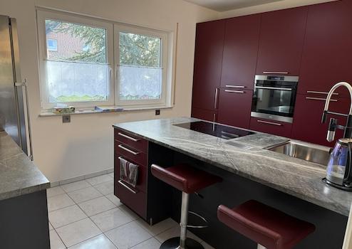 • Markenküche mit Steinarbeitsplatten, großem Edelstahlspülbecken und Einbaugeräten hochpreisiger Hersteller (Miele, AEG und Co.)