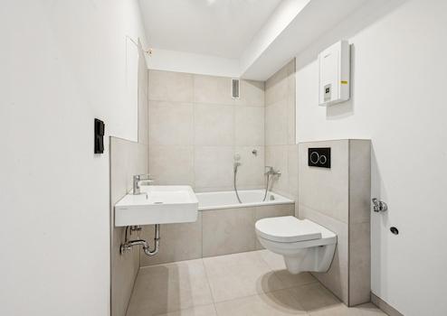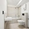 Das stilvoll modernisierte Badezimmer präsentiert sich in zeitlosem, neutralem Design und ist mit einer Badewanne ausgestattet – perfekt für entspannte Momente.