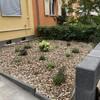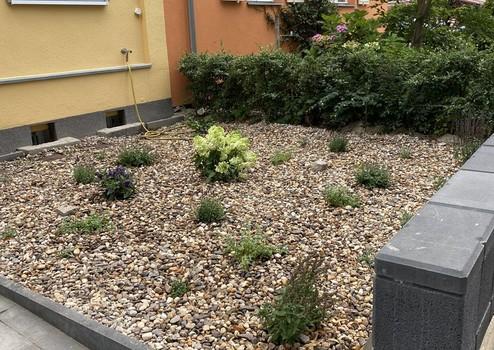 Bepflanzter Vorgarten sowie Fahrradabstellhäuschen direkt vor dem Haus