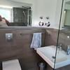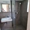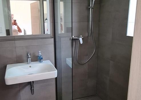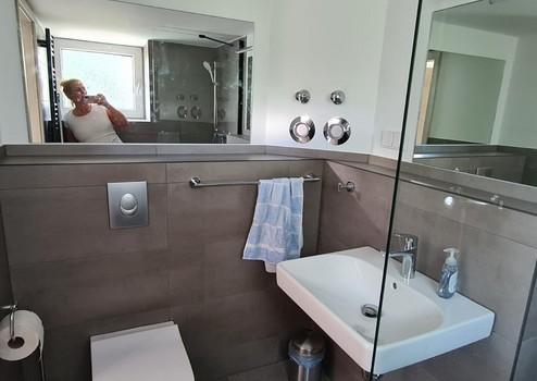 Im Badezimmer ist eine Dusche, ein WC sowie ein Waschbecken vorhanden.
