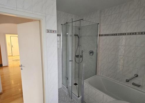 Wellness-Bad: Tageslichtbad mit Badewanne und separater Dusche sowie ein zusätzliches Gäste-WC.