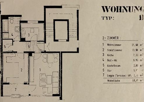 Zum Verkauf steht eine gepflegte und seit 2023 vermietete 2-Zimmer-Wohnung mit einer Wohnfläche von ca. 59 m². Die Wohnung verfügt über einen funktionalen, gut geschnittenen Grundriss sowie eine angenehm belichtete Loggia, die den Wohnwert zusätzlich erhöht.