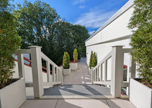 Dieser wird gekrönt mit dem Ausblick auf die traumhafte, einmalig große Dachterrasse (über 50qm) mit atemberaubenden Panoramablick, der sich weit über das Isartal und den majestätischen alten Baumbestand des Englischen Gartens zieht.