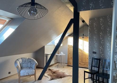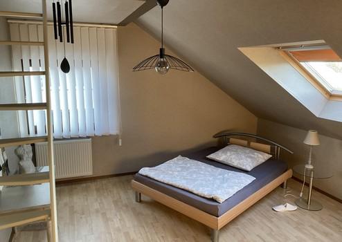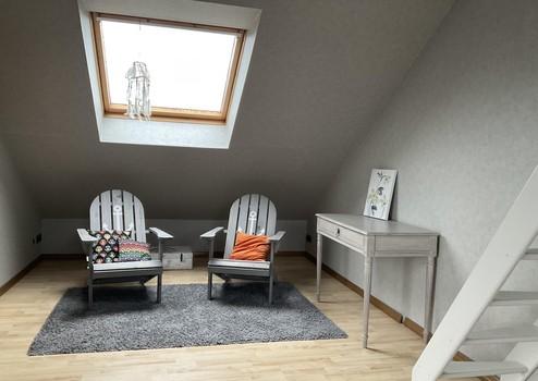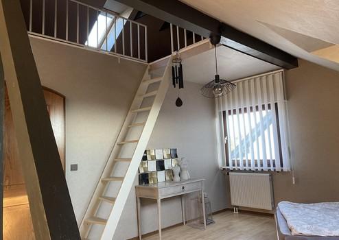 Das Obergeschoss, das sich bei Bedarf problemlos in eine zweite Wohneinheit umgestalten lässt, bietet zwei großzügige Zimmer, die jeweils über eine offene Galerie verfügen. Zudem befindet sich hier ein Balkon, auf dem man die Nachmittags- und Abendsonne genießen kann. Eine voll ausgestattete Küche, ein Badezimmer sowie ein geräumiger Abstellraum ergänzen das Raumangebot dieser Etage.
