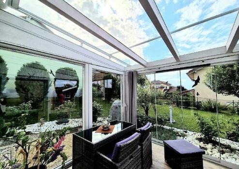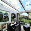 Der Wintergarten verfügt über eine elektrische Außenbeschattung sowie seitliche manuelle Beschattungselemente, sodass auch an sonnigen Tagen ein angenehmes Raumklima gewährleistet ist.