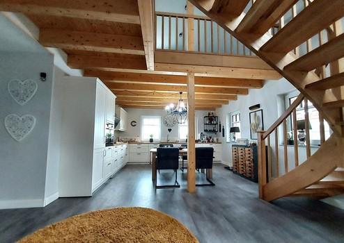 Der offene und großzügige Wohnraum mit angrenzender Landhausküche und Blick hoch in die Galerie ist der Mittelpunkt des Hauses.
