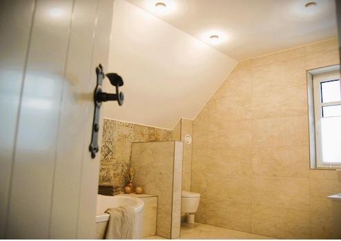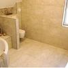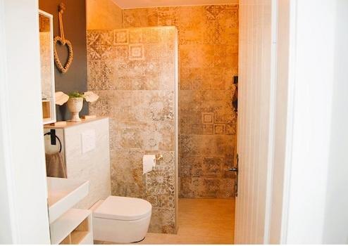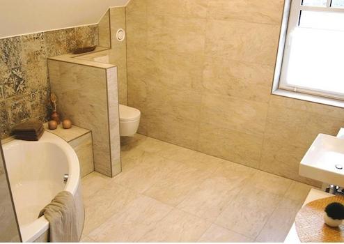 Ein hochwertig ausgestattetes Bad mit großen Fliesen und Ebenerdiger Dusche liegt ebenfalls im Erdgeschoss.