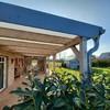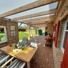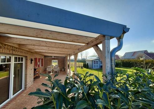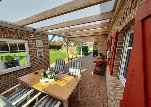 Aus dem Wohnzimmer heraus betritt man direkt die große, überdachte Terrasse (ca. 43 qm) mit dem vor Regen schützendem Windfang.