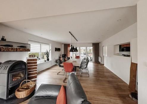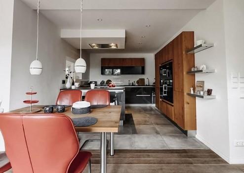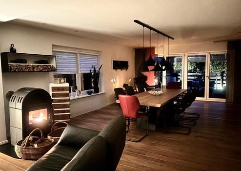 Der offene Wohn- und Essbereich mit gemütlichem Kamin bildet zusammen mit der teilintegrierten Küche das Herzstück des Hauses und lädt mit der überdachten Terrasse/ Sommergarten zu geselligen Stunden mit Familie und Freunde ein.