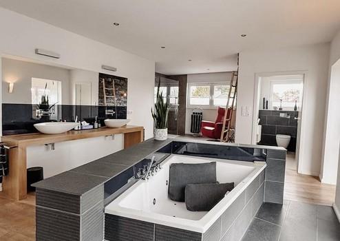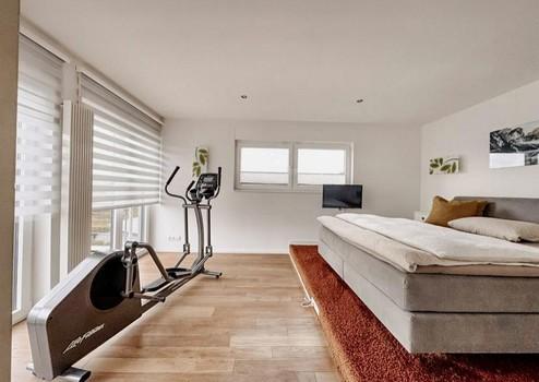 Das Masterbad im OG gleicht einer Wellness-Oase und bietet Ihnen den Luxus von Komfort und Stil. Hier können Sie sich in dem Whirlpool mit Blick und Zugang auf die Dachterrasse entspannen und den Alltagsstress hinter sich lassen. Die große begehbare Dusche (u.a. mit der Hans Grohe Raindance Kopfbrause) ist überwiegend 2025 modernisiert worden.
