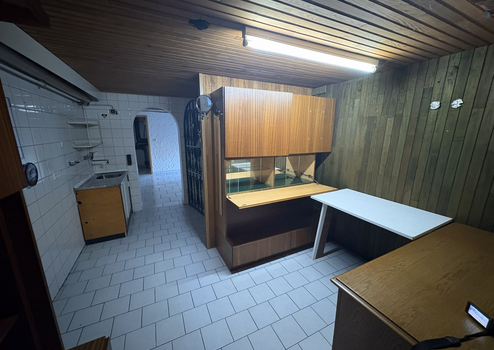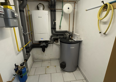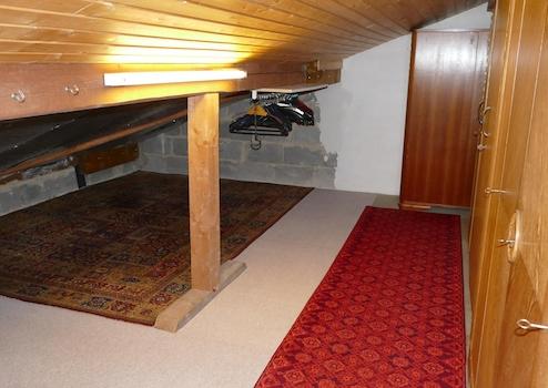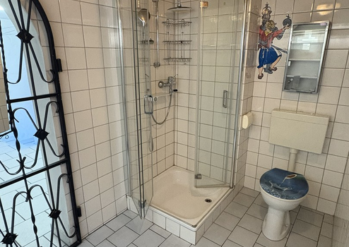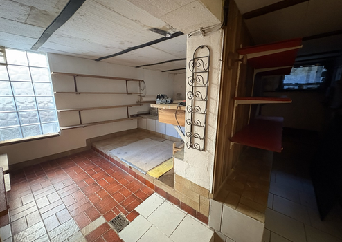 Das Untergeschoss besteht aus einem Keller, zugehörig zur EG-Wohnung und einer ELW. Der Keller ist aufgeteilt in ein Treppenhaus, Heizungsraum, Vorratskeller und zwei weitere große Kellerräume. Hier ist noch eine separate Dusche mit WC eingebaut, ein Anschluss für eine Waschmaschine ist vorhanden.