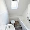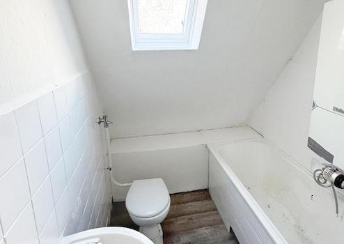 Das Badezimmer ist an Wänden mit Fliesen belegt. Es ist mit einer Badewanne, einem Waschbecken und einem WC ausgestattet.