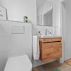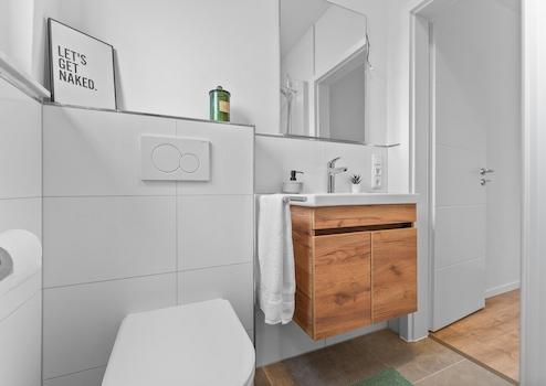 -Tageslichtbad mit Waschtisch, Dusche, Handtuchheizkörper und WC
