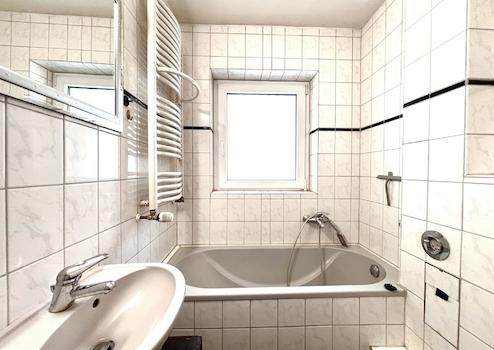 Das Tageslichtbad ist mit einer kleinen Badewanne ausgestattet und lädt nach einem langen Arbeitstag zum Entspannen ein. Die voll ausgestattete Einbauküche ist bereits im Kaufpreis enthalten.