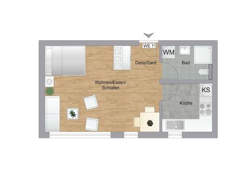 Sie verfügt über eine Wohnfläche von ca. 29,4 m², aufgeteilt in ein geräumiges Wohn-/Schlafzimmer, eine separate Küche sowie ein Badezimmer. Hier ist auch ein Anschluss für die Waschmaschine vorhanden.