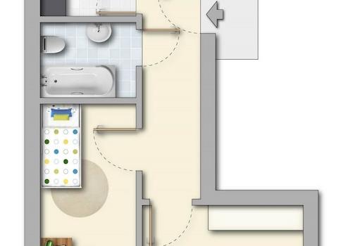 Die Wohnung befindet sich im 5. OG eines Mehrfamilienhauses für Singles, Paare und Familien. Das Objekt verfügt über keinen Aufzug.