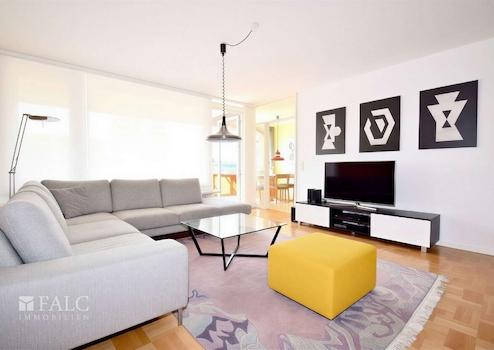 Das Wohnzimmer ist geräumig und bietet Zugang zu einem Süd-Balkon, der sich perfekt für entspannte Stunden im Freien eignet. Hier können Kinder sicher spielen, während die Eltern die Aussicht genießen.