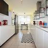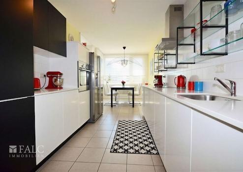 Die Küche bietet ausreichend Platz für gemeinsame Mahlzeiten und ist mit langlebigen Materialien ausgestattet. Die hellen Fliesen und die gut durchdachte Anordnung der Arbeitsflächen sorgen für eine angenehme Arbeitsatmosphäre. Ein besonderes Highlight ist der angrenzende Essbereich, der durch die großen Fenster viel Tageslicht erhält und einen schönen Blick ins Freie bietet.