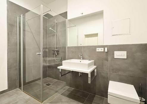 - Badezimmer mit ebenerdiger Dusche und Handtuchheizkörper