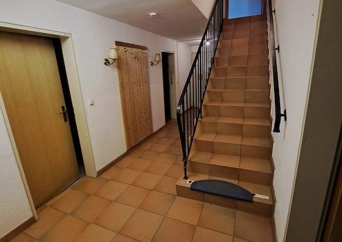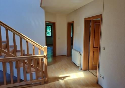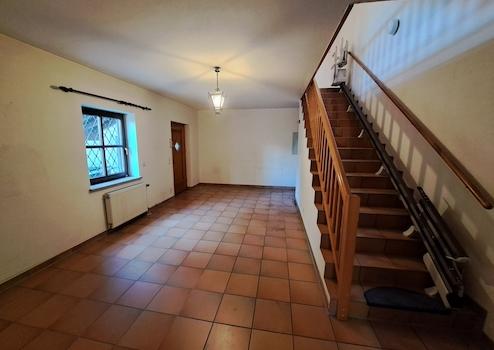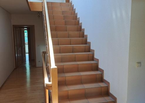 Der gesamte Eingangsbereich, die Garderobe und die Treppen (vom Keller bis ins DG), sowie der gesamte Kellerflur sind gefliest. Wobei die Treppe vom EG ins Obergeschoß mit einem Treppenlift ausgestattet ist und so einen barrierefreier Zugang ermöglicht wurde. Die Treppengeländer und Handläufe sind vom Erdgeschoss bis ins Dachgeschoss passgenau in Holz angefertigt.