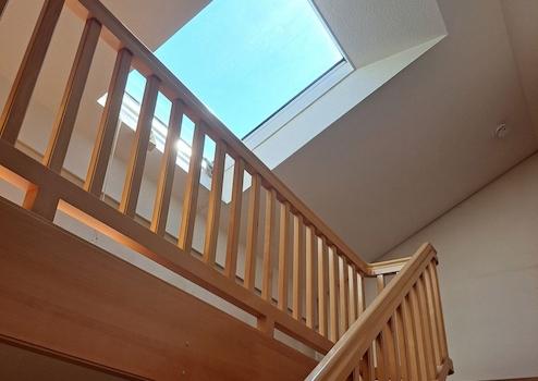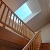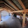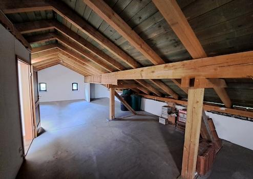 Weiter geht es über die Treppe in das Dachgeschoss. Die Geschossdecke (Beton) und das Gebälk des Dachbodens sind sichtbar. Je zum Giebel sind 2 kleine gewölbte Fenster eingebaut. Der Zugang auf das großflächige Dach wird durch 2 Dachfenster gewährleistet.