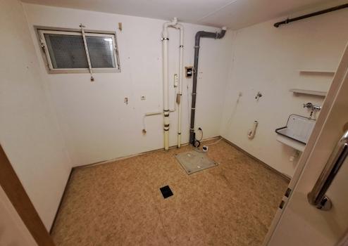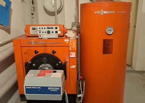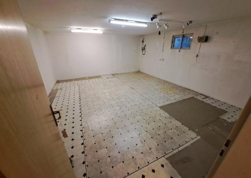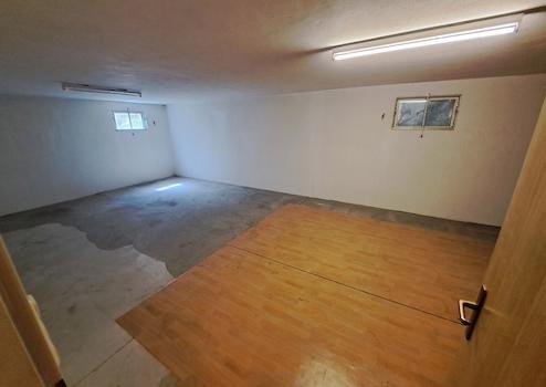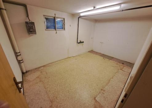 Wieder im Erdgeschoss angekommen führt eine geflieste Treppe von der Eingangshalle aus in den Keller. Hier befinden sich das Öltanklager und die Ölheizung. Darüber hinaus gibt es eine zentrale Warmwasserversorgung. Neben dem Wasch- und Vorratsraum sind noch drei weitere Räume im Untergeschoss.