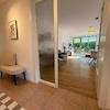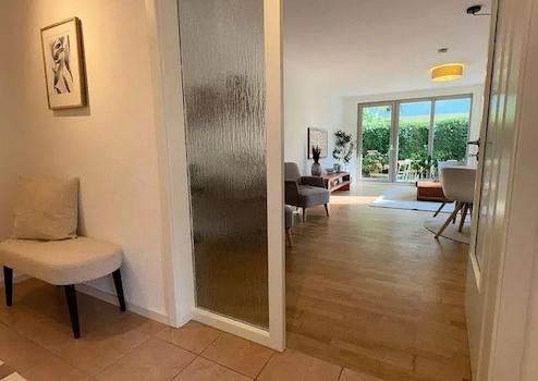 Bereits der einladende Eingangsbereich vermittelt Großzügigkeit und bietet Platz für eine Garderobe oder individuelle Einrichtungsideen. Der Wohnbereich ist durch große, bodentiefe Fenster lichtdurchflutet und öffnet sich zur Terrasse mit etwa 40 m² Gartenanteil. Hier genießen Sie sonnige Stunden in privater Atmosphäre.