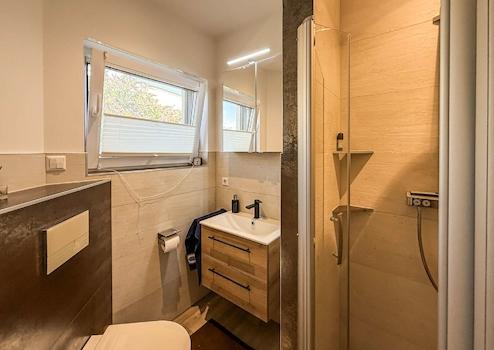 Die Einliegerwohnung verfügt über einen hellen Wohn- und Essbereich mit Küche, zwei Schlafzimmer, ein großzügiges Bad sowie ein Gäste-WC – ebenfalls mit Zugang zur eigenen Terrasse.