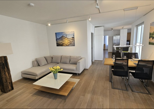 Der offene Wohn- und Essbereich schafft eine moderne, internationale Wohnatmosphäre mit viel Licht und Raum – in dieser Form in München selten zu finden.