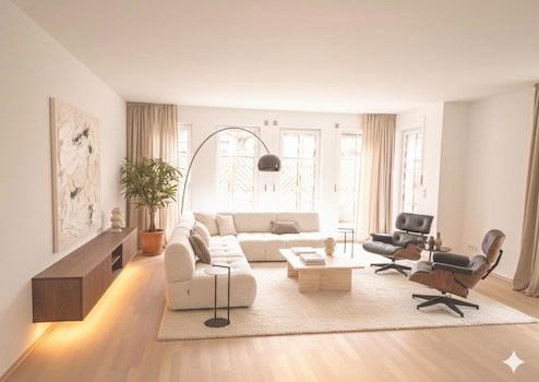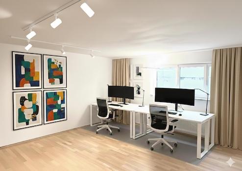 Es handelt sich um maßstabsgetreue Fotos, welche mit KI bearbeitet wurden. So oder ähnlich könnte der Raum nach erfolgter Renovierung und mit neuer Ausstattung aussehen.