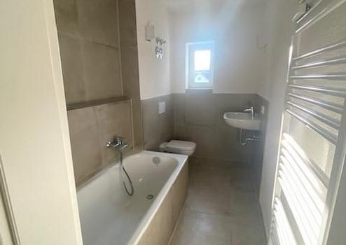 Das Badezimmer verfügt über eine Badewanne und ist zeitlos gefliest. Es bietet ausreichend Platz und Komfort für den Alltag.