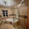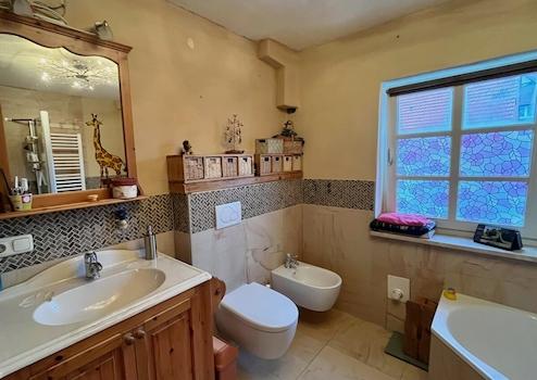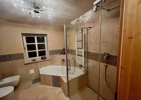 - großes Badezimmer mit Badewanne, barrierefreie Dusche, WC, BD und Waschbecken