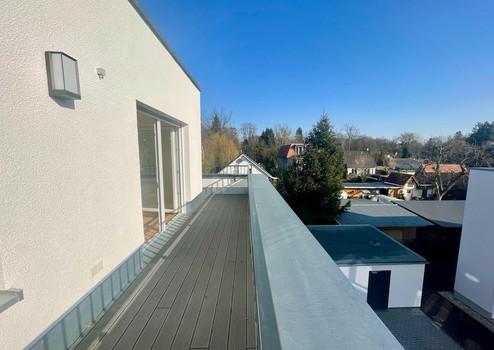 Vom Wohn-Essbereich aus gelangen Sie direkt auf die große Dachterrasse, die in den warmen Monaten als erweiterter Wohnraum genutzt werden kann. Ob Frühstück in der Sonne, ein Glas Wein am Abend oder kleine Kräuter- und Pflanzenarrangements – die Dachterrasse bietet vielfältige Nutzungsmöglichkeiten und lädt zum Entspannen im Freien ein.