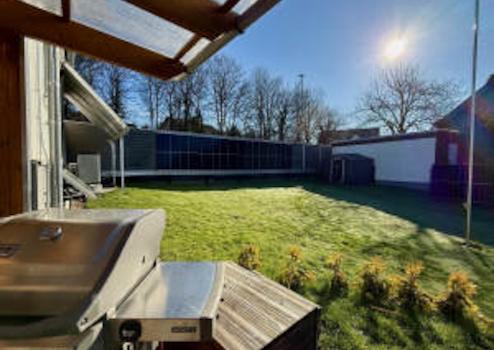 Der blickdichte Garten lädt mit seiner überdachten Holz-Terrasse zum Sonnenbaden und geselligen Beisammensein ein - ein perfekter Ort für unbeschwerte Momente oder entspannte Tage im Freien. Kinder können hier außerdem unbedarft herumtollen.