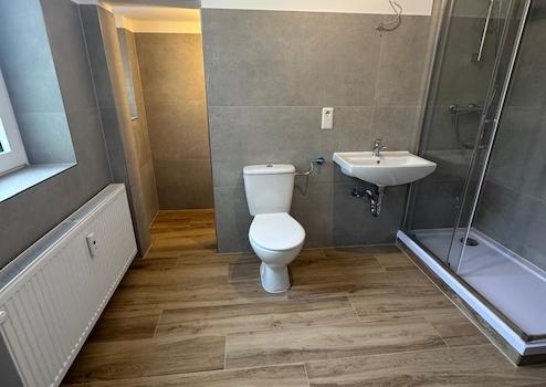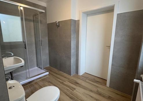 Das neue Tageslichtbad wurde mit zeitlosen, großformatigen Fliesen in Grau ausgestattet und mit modernen Sanitärobjekten versehen. Eine komfortable Duschkabine mit Glasabtrennung, neue Armaturen sowie ein zusätzlicher, separat gefliester Bereich bieten funktionalen Mehrwert – ideal für Waschmaschine oder Stauraumnischen.