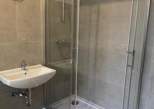 - Moderne Sanitärobjekte (WC, Waschbecken, verglaste Duschkabine)