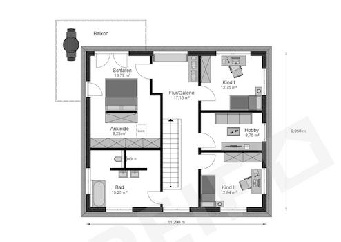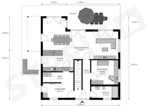 Im Erdgeschoss befindet sich der große Wohn-/Ess- und Kochbereich. Das Gäste-WC wird optional zum Duschbad erweitert und der Hauswirtschafts-/Haustechnikraum komplettiert das Ganze. Im Obergeschoss befinden sich ein ...